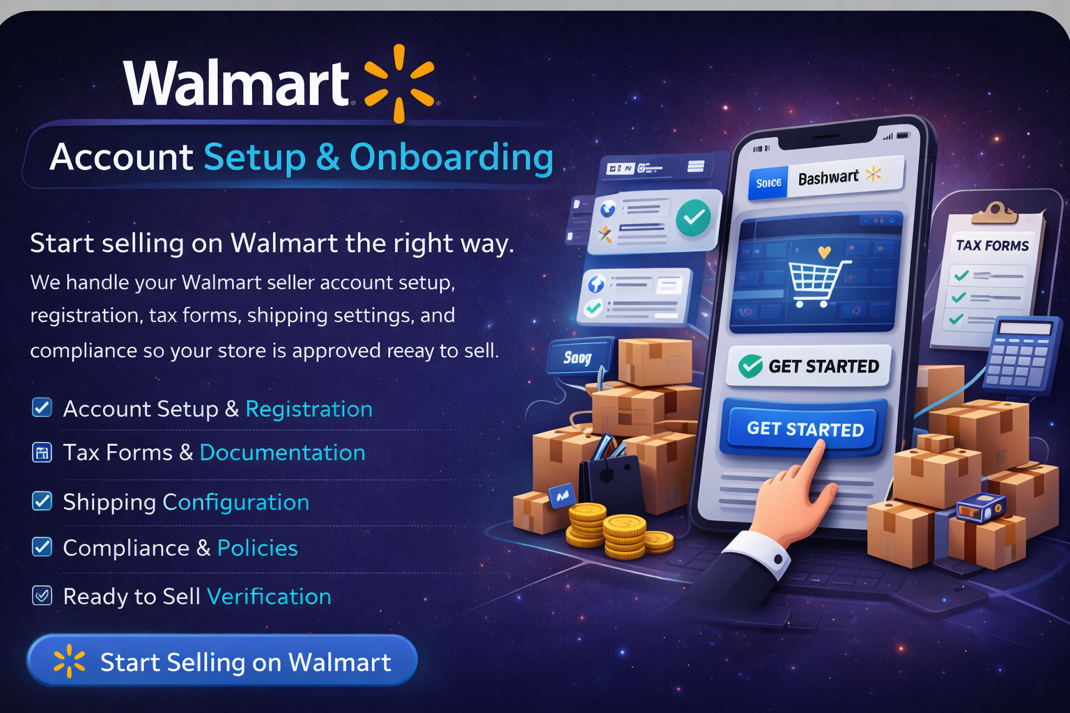 Start selling on Walmart the right way. We handle your Walmart seller account setup, registration, tax forms, shipping settings, and compliance so your store is approved and ready to sell.