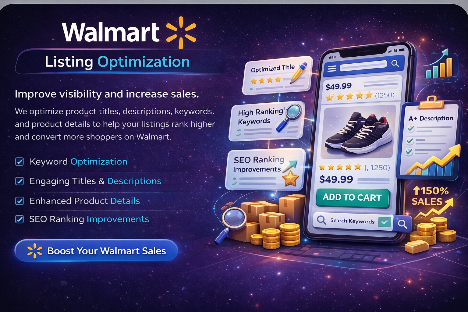 Improve visibility and increase sales. We optimize product titles, descriptions, keywords, and product details to help your listings rank higher and convert more shoppers on Walmart.