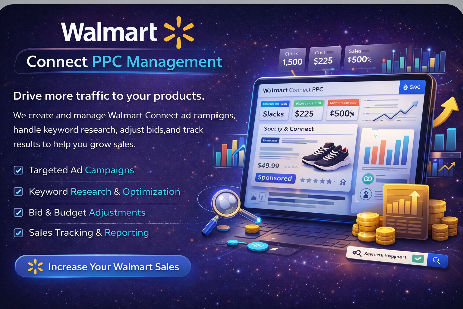 Drive more traffic to your products. We create and manage Walmart Connect ad campaigns, handle keyword research, adjust bids, and track results to help you grow sales.