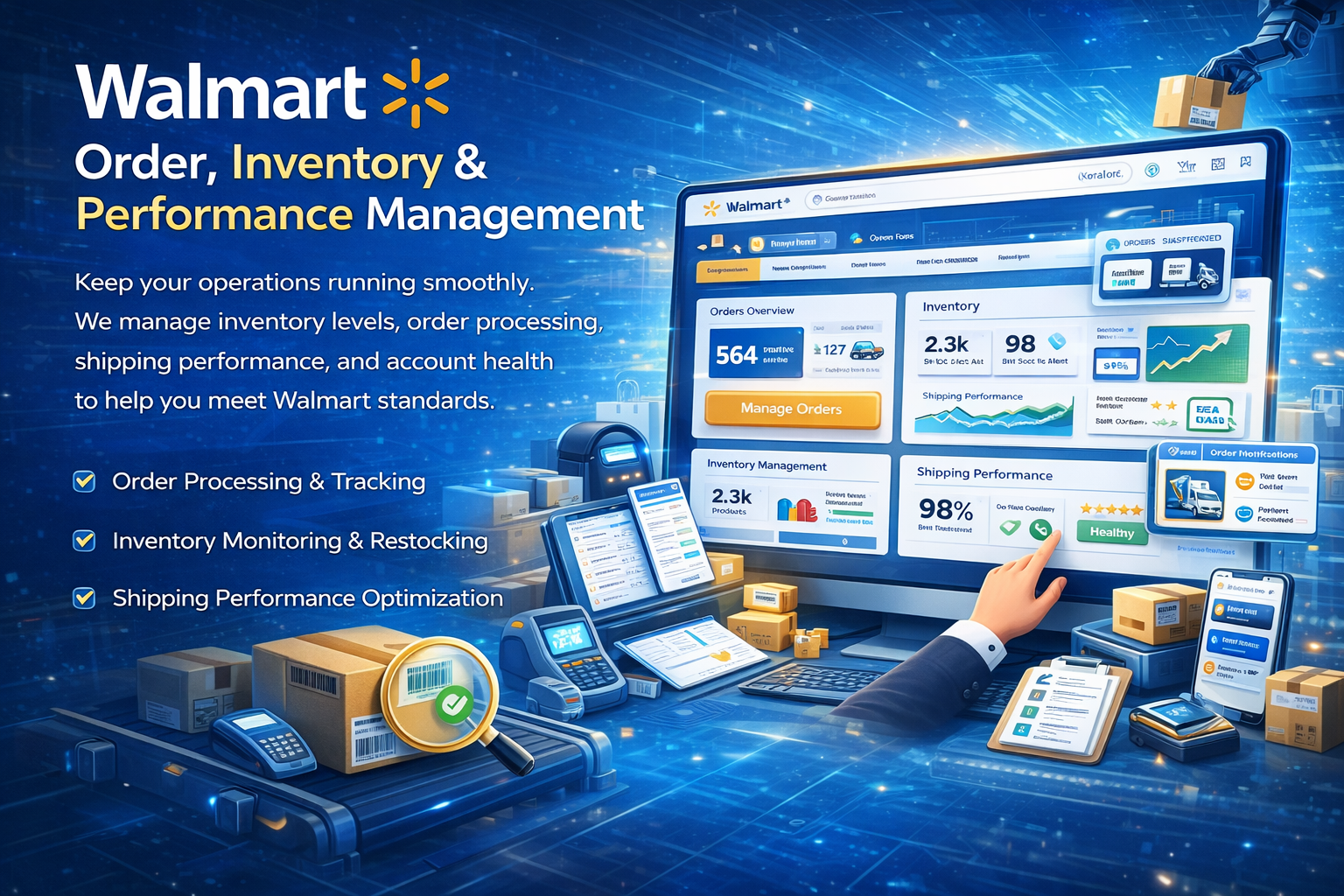 Keep your operations running smoothly. We manage inventory levels, order processing, shipping performance, and account health to help you meet Walmart standards.