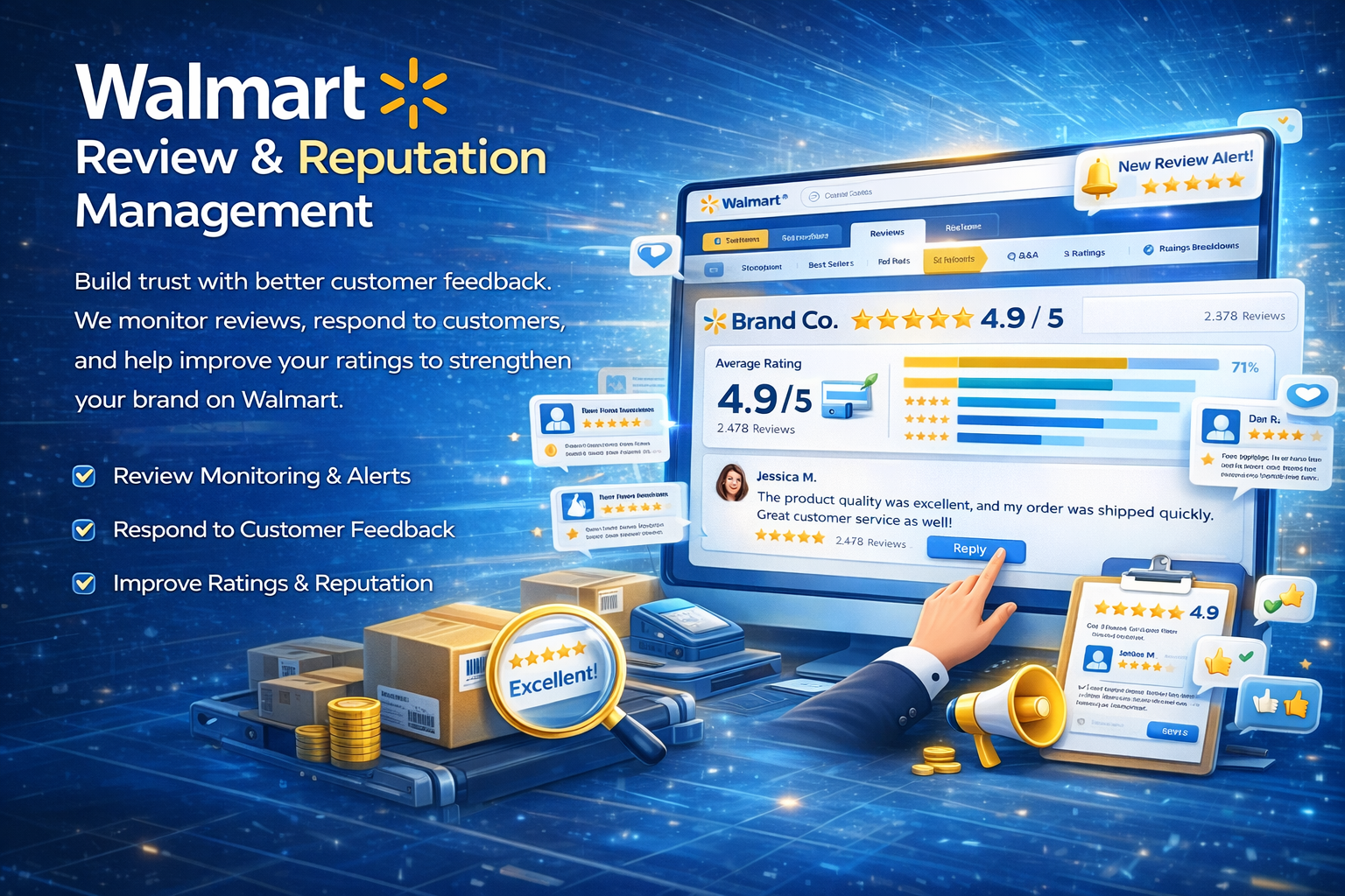 Build trust with better customer feedback. We monitor reviews, respond to customers, and help improve your ratings to strengthen your brand on Walmart.